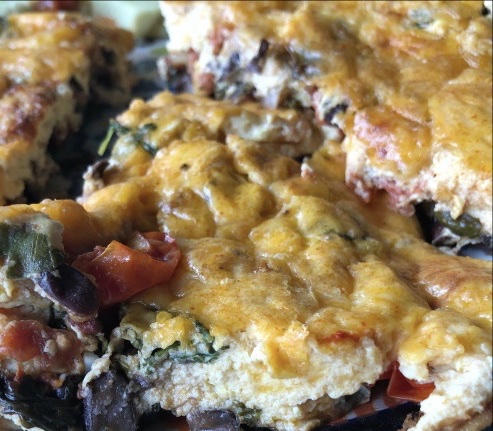 This is very easy and perfect for Meatless Monday. It is a vegetarian frittata recipe, but you won’t miss the meat! It has tons of flavor. I make mine Weight Watchers friendly by using low fat cheeses, sour cream, etc – but it’s definitely not necessary. Use what you already have!