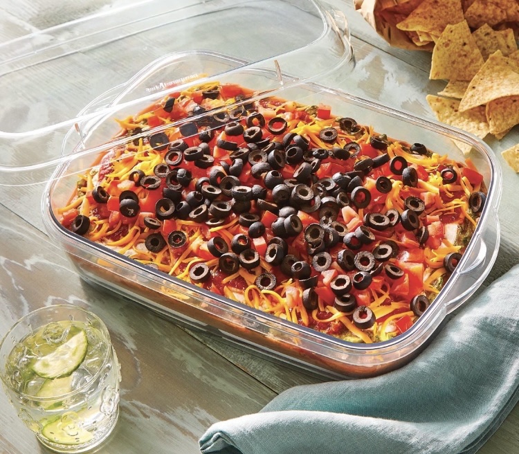This is something honestly super useful. The Rectangular Cool & Serve is 9″ x 13″ (23-cm x 33-cm) It includes two chilling pucks that will keep your food cool for 4–6 hours and is fridge-, freezer-, and dishwasher-safe. The spill-resistant lid is great for taking food on the go and nests under the base, so serving is easy. I love it!