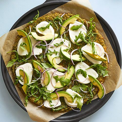 THIS GREEN PIZZA HAS A BROCCOLI AND ALMOND FLOUR CRUST THAT’S TOPPED WITH FRESH MOZZARELLA, AVOCADO, RED ONION, AND ARUGULA. LEMON JUICE KEEPS THE FLAVORS BRIGHT.